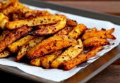 Сладкий картофель, замоченный на пару часов в холодной воде, приправленный солью и покрытый оливковым маслом и запеченный в духовке.