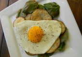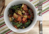 Цуккини и желтый сквош, сладкий картофель и мангольд, обжаренные в красном вине и вустерском соусе. Подаются с киноа.