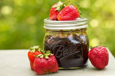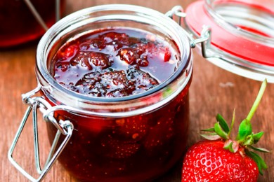 Джем из клубники с перцем чипотле и лимонным соком и цедрой. Если часть использованной для джема клубники будет слегка недозрелой (около 1/4 ягод), содержание пектина в джеме повысится.