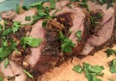 Из свиной мякоти готовим запеченный рулет с зеленью. Для вкусного аромата выбирайте острые приправы с чесноком и чили, перед отправкой в духовку дайте мясу промариноваться хотя бы полчаса-час.