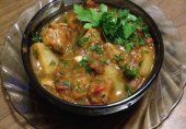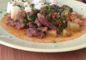 Азу – классическое блюдо татарской кухни, корни которого уходят в Древнюю Персию. Основные ингредиенты азу – ломтики мяса (баранина, говядина или конина) и тушеные овощи: соленые огурцы, помидоры.