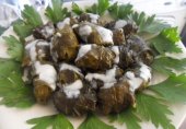 Армянская долма готовится из виноградных листьев, фарша и риса. Подается с мацуном с толченым чесноком.