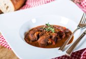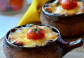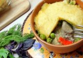 Жаркое из говяжьей печени с грибами под сырным тестом
