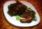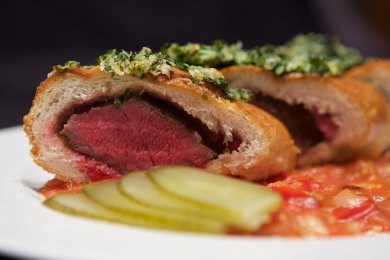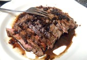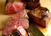 Говяжье филе, маринованное в бальзамическом уксусе с вустерским соусом, чесноком, йогуртом и орегано и приготовленное на гриле, и сальса из клубники с луком, перцем халапеньо и кинзой.