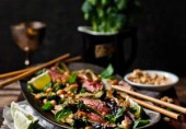 Говяжий стейк, жаренный на оливковом масле, с китайской капустой, политые соевым соусом с чесноком, имбирем, лимонным соком и кунжутным маслом.