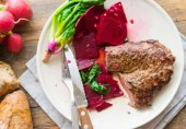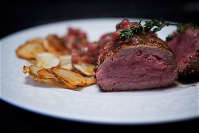 СТЕЙК С ГРАНАТОВО-ЛУКОВЫМ СОУСОМ И ТОПИНАМБУРОМ