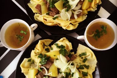 БЕШБАРМАК 🤤Бешбармк, бишбармак, бесбармак -традиционное мясо-мучное блюдо тюркоязычных народов. В целом, блюдо представляет собой крошеное отварное мясо с лапшой, луковым соусом и некоторыми особенностями в технологии приготовления и подачи, что позволяет достичь вкуса, присущего именно этому блюду.