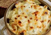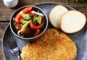 Этот рецепт чем-то напоминает мясо по-французски. Отличается тем, что мясо нарезается тонкими ломтиками, отбивается молоточком.