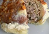Нежнейший фаршированный картофель под чесночным соусом отлично подойдёт для праздничного стола.