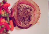 Медальоны из говядины, обернутые в бекон, с жаренными овощами.