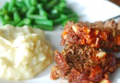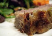 Митлоф из говяжьего фарша с луком, вустерским соусом и специями, покрытый соусом и запеченный в духовке.