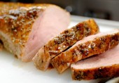 Свиная корейка, натертая смесью шалфея с розмарином, чесноком, оливковым маслом и специями и запеченная в духовке.