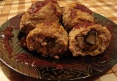 Зразы из говяжьего и свиного фарша с начинкой из жареных грибов с луком и вареными яйцами.
