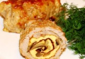 Рулетики из отбитого мяса с начинкой из омлета с жареными грибами и луком, обжаренные в масле и запеченные в духовке.