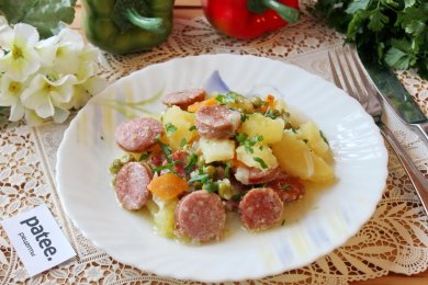 Картофель, приготовленный в горшочке в духовке, всегда получается сочным и нежным. А если вы добавите копченые колбаски, то он приобретет вкус копченостей и их аромат.