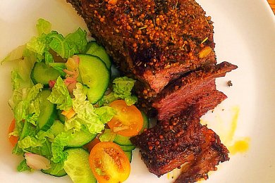 Говяжья вырезка, натертая сушеными травами и специями и запеченная в духовке.