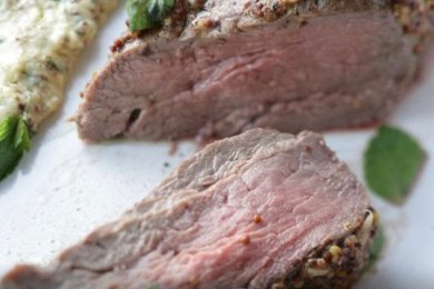 Ростбиф с мятой, чесноком и орегано, обжаренный на сковороде, а затем приготовленный в духовке.