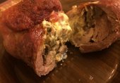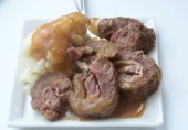 Рулетики из говядины с беконом и луком, обжаренные в масле и залитые мучным соусом. Прекрасно сочетаются с картофелем и макаронами, а также любыми салатами, на ваш вкус.