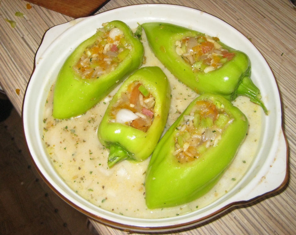 Вылейте соус в форму для запекания. Выложите перцы и поставьте в горячую духовку.