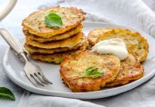 Эти оладьи прекрасно подойдут в качестве гарнира к мясным блюдам. Но мне нравится со сметаной, перемешанной с укропом.