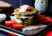 Запеченные оладьи с цуккини и тунцом под лимонно-йогуртовым соусом.