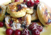 Эти оладьи получаются очень мягкими, воздушными и упругими. Вишня и сахарная пудра делают их полноценным десертом, хотя можно и полить их каким-нибудь сиропом или сметаной.