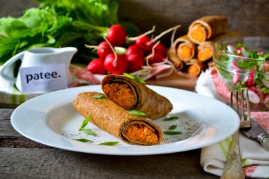 Фарш с морковкой и луком прожарьте до готовности.Одновременно приготовьте блины.По итогу просто заверните начинку в готовые блинчики.
