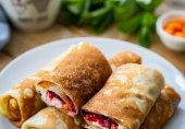 Эта закуска не только вкусная и красивая, но и очень сытная благодаря блинам и сливочному сыру. Сочетание сыра с красной рыбой и ярким свежим огурчиком делает вид в разрезе очень аппетитным, поэтому перед подачей разрежьте блинчики пополам и выложите на тарелку с листьями салата.