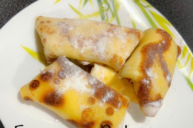 Яйца взбить венчиком, добавить разогреты тёплое молоко к яйцам, туда же добавить 400 г просеянный муки, щепотку соли, три чайных ложки сахара, и ванилин.