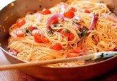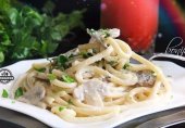 Паста карбонара – это спагетти с тонкими ломтиками бекона, залитые сверху соусом из яиц и сыра. Этот соус доходит до полной готовности от жара только что сваренной пасты.