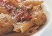 Пенне с фрикадельками, томатами в собственном соку и пармезаном.