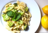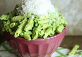 Паста с соусом песто из зеленого горошка с тертым пармезаном, чесноком и лимоном.