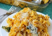 Запеканка из пасты с тыквенным пюре, сыром, капустой кале, пармезаном и специями.