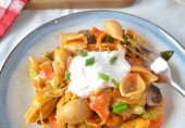 Запеканка из пасты с морковью, сладким перцем, грибами, брюссельской капустой, чеддером и острым соусом.