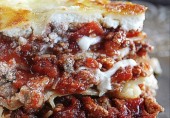 Слоеная запеканка из лазаньи с соусом из говяжьего фарша со специями и соусом бешамель, посыпанная тертым сыром.