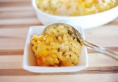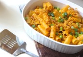 Запеканка из пасты с сыром, соусом шрирача, сухарями и яйцом, посыпанная свежим зеленым луком.