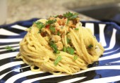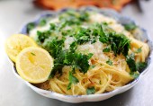 Спагетти в соусе из лимоного сока с цедрой, яичными желтками и сыром пармезан. Подавайте, посыпав свежим базиликом.