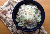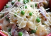 Паста с жареным беконом и зеленым горошком в соусе из сливок с пармезаном.