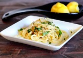 Паста в соусе из сметаны с чесноком, лимонным соком и цедрой, запеченная в духовке. Подавайте, посыпав тертым сыром и зеленью и сбрызнув лимонным соком.