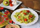 Паста с соусом из авокадо, печеного чеснока и лимона со специями. Подавайте с печеными помидорками, посыпав тертым сыром.