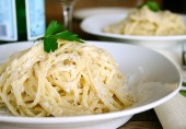 Простой и вкусный обед за 15 минут - паста лингвини в сливочном соусе с чесноком и тертым сыром.