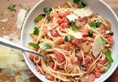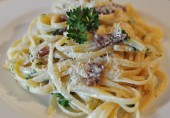 Паста лингвини в соусе с пармезаном, сливками и жареным беконом. Перед подачей посыпьте свежей зеленью и тертым пармезаном.