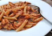 Паста с обжаренном на гриле куриным филе и беконом с томатном соусе с чесноком, зеленью, медом, сливками и красным вином.