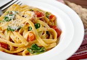 Паста феттучини в соусе из свежих и вяленых помидоров с базиликом, шпинатом, сливками, пармезаном и специями.