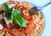 Спагетти в соусе из томатного пюре с чесноком и паприкой, посыпанные тертым пармезаном и раскрошенным жареным беконом.
