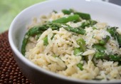 Паста орзо со спаржей и тертым пармезаном, приправленная чесноком и цедрой лимона.