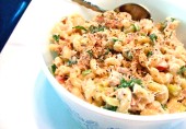 Паста с консервированным тунцом, сельдереем, редисом и зеленью, заправленная йогуртом и лимонным соком.