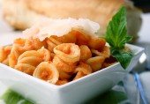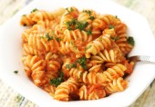 Паста в сливочно-томатном соусе с красным вином, луком, чесноком и специями.