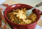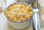 Паста в соусе с тремя сырами - чеддером, грюйером и пармезаном, посыпанная сухарями и запеченная в духовке.