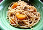 Холодное блюдо - спагетти под соусом из арахисового масла с медом, кунжутным маслом, соевым соусом и винным уксусом.